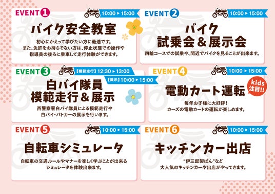 本イベントでは、最新バイクの試乗・展示をはじめ、白バイ隊員による模範走行やプロの指導による安全教室も実施いたします。また、お子様向けの電動カート運転やキッチンカーなどの出店もあり、一日を通してご家族皆様でお楽しみいただけます。会場には60台分の駐車場を完備しており、お車でのご来場も安心です。週末のお出かけ先に、ぜひ「第14回 春のバイクフェスタ in 姪ドラ」へお越しください。 【開催概要】 日時: 4月29日(火・祝) 10:00~15:00 場所: 姪浜ドライビングスクール [https://www.meids.co.jp/] 料金: 入場無料 主催: 姪浜ドライビングスクール 【主なコンテンツ】 バイク試乗会&展示会: 人気メーカーの最新モデルを実際に試乗・体感できます。 白バイ隊員模範走行&展示: 普段見ることのできない白バイの走行技術を間近で披露。車両展示や隊員との交流も予定。 バイク安全教室: 経験豊富なインストラクターによる、安全運転のための基礎知識やテクニックを学べる教室。 電動カート運転体験: 小さなお子様でも安全に楽しめる電動カートをご用意いたします。 自転車シミュレータ: 画面を見ながら安全な自転車の乗り方を学べるシミュレータを体験できます。 キッチンカー・出店: キッチンカーや出店もご用意しております。休憩やお食事の際にご利用ください。