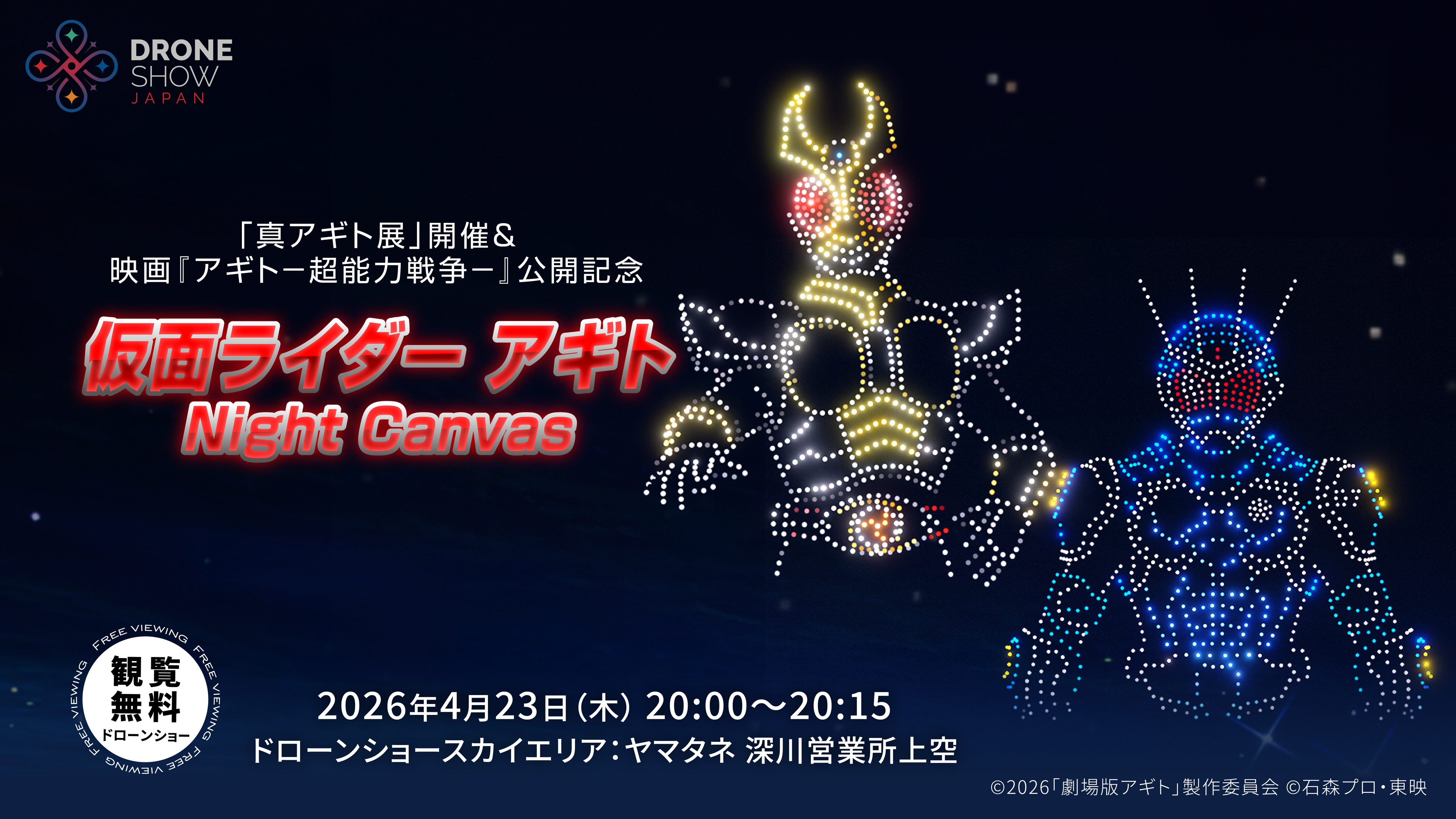 株式会社ヤマタネと株式会社ドローンショー・ジャパンは、東映株式会社らと共催で、2026年4月23日(木)に特別ドローンショー<仮面ライダーアギト Night Canvas>を開催します。