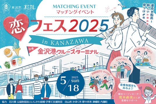 株式会社オミカレ(本社:東京都渋谷区、代表取締役社長:下永田真人、以下「オミカレ」)は、会員数91万人超の、「今月行ける婚活パーティー・街コン」掲載数日本No.1※を誇る日本最大級の婚活情報サイト「オミカレ」や、通話型マッチングアプリ「オミカレLive」を運営しています。  オミカレは2025年5月18日(日)、石川県金沢市と連携したマッチングイベント 『恋フェス2025 in KANAZAWA~運命の船出!新しいトキメキ、見つけよう~』を金沢港クルーズターミナルにて開催することとなりました。  このイベントは、全国の20~39歳の独身男女を対象に開催。