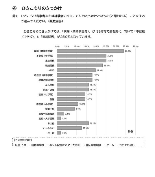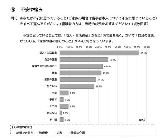 当事者や家族の方にアンケートを取った結果、どの年代、立場でも経済面への不安が大きいこころの不調を感じていたり、人間関係に不安を感じている人が多い専門的な知識のある人への相談や、無料で相談できることが求められている周囲へのひきこもりに関する理解も求めているということが分かりました。