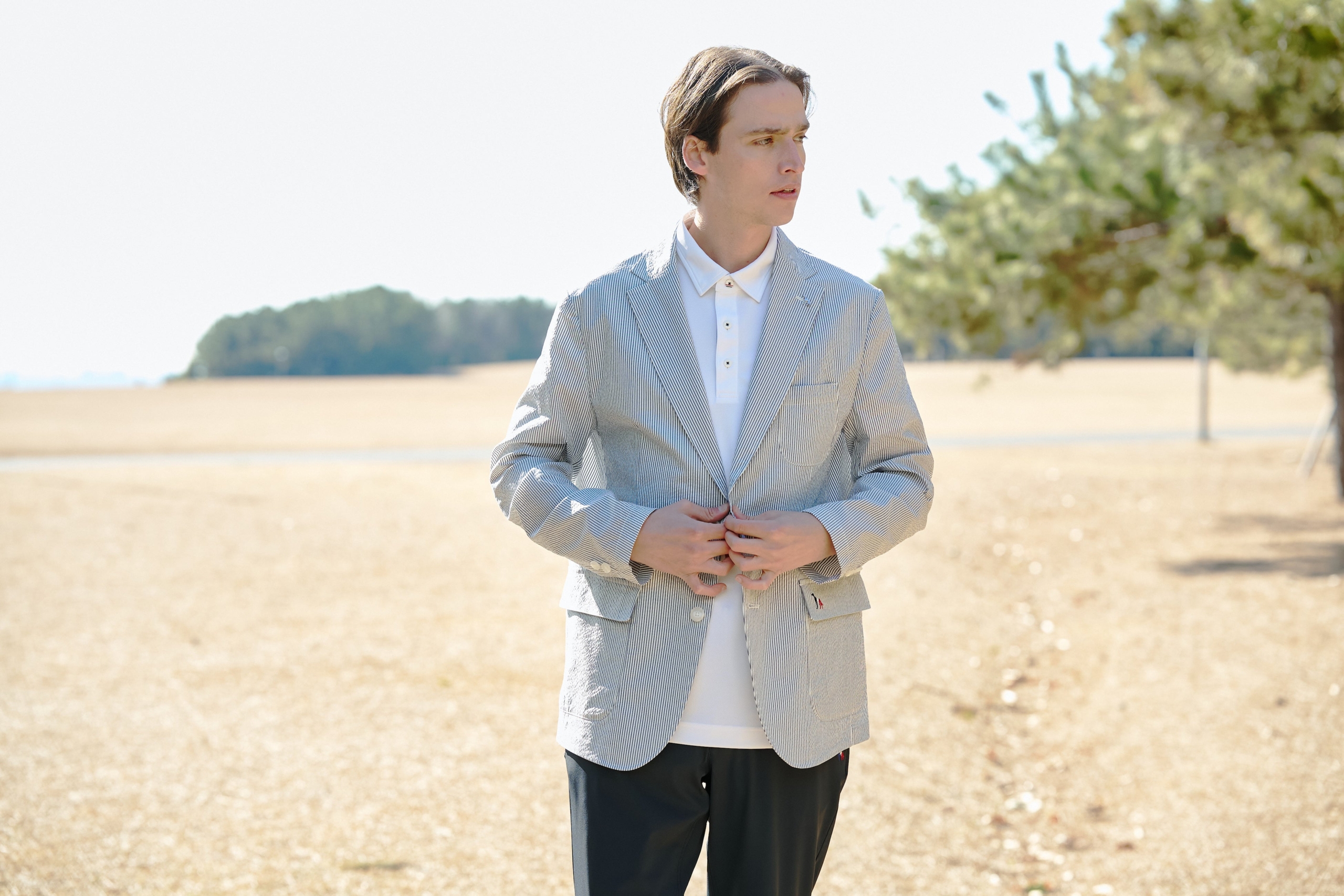 シルエットは程よくリラックスしたフィット感で、クラブハウスで優雅に着こなせる一着です。
