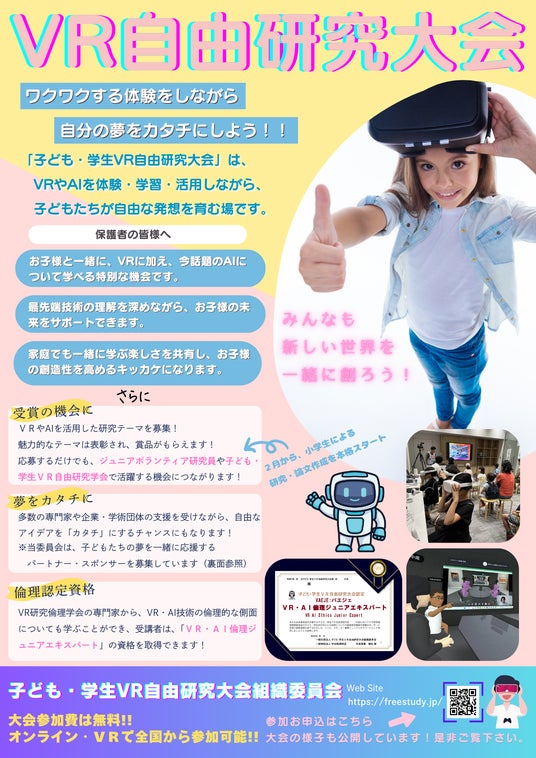 目的:子ども・学生VR自由研究大会の開催を通じて、日本の将来を担う科学者を育成し、学術及び科学技術の振興と児童及び青少年の健全な育成に寄与すること