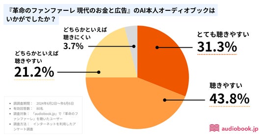 『革命のファンファーレ 現代のお金と広告』のAI本人オーディオブックについて、視聴したユーザーの96.3%が「聴きやすい」と回答(「とても聴きやすい」31.3%、「聴きやすい」43.8%、「どちらかといえば聴きやすい」21.2%)。