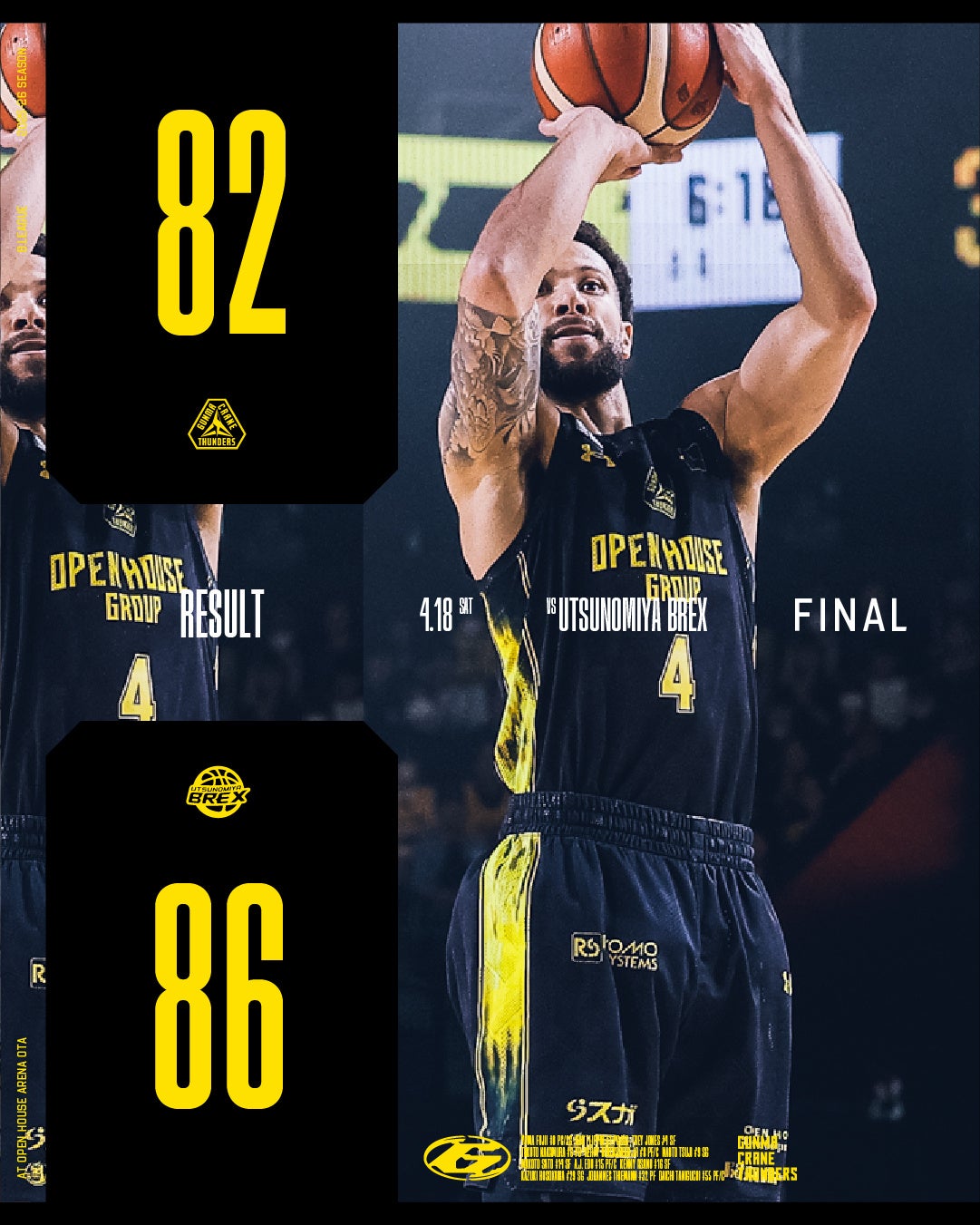 2026年4月19日(日)、オープンハウスアリーナ太田で行われた群馬クレインサンダーズ対宇都宮ブレックスの一戦。地区1位を狙う群馬は、王者の意地を見せた宇都宮の終盤の遂行力に屈し、惜しくも逆転負けを喫しました。