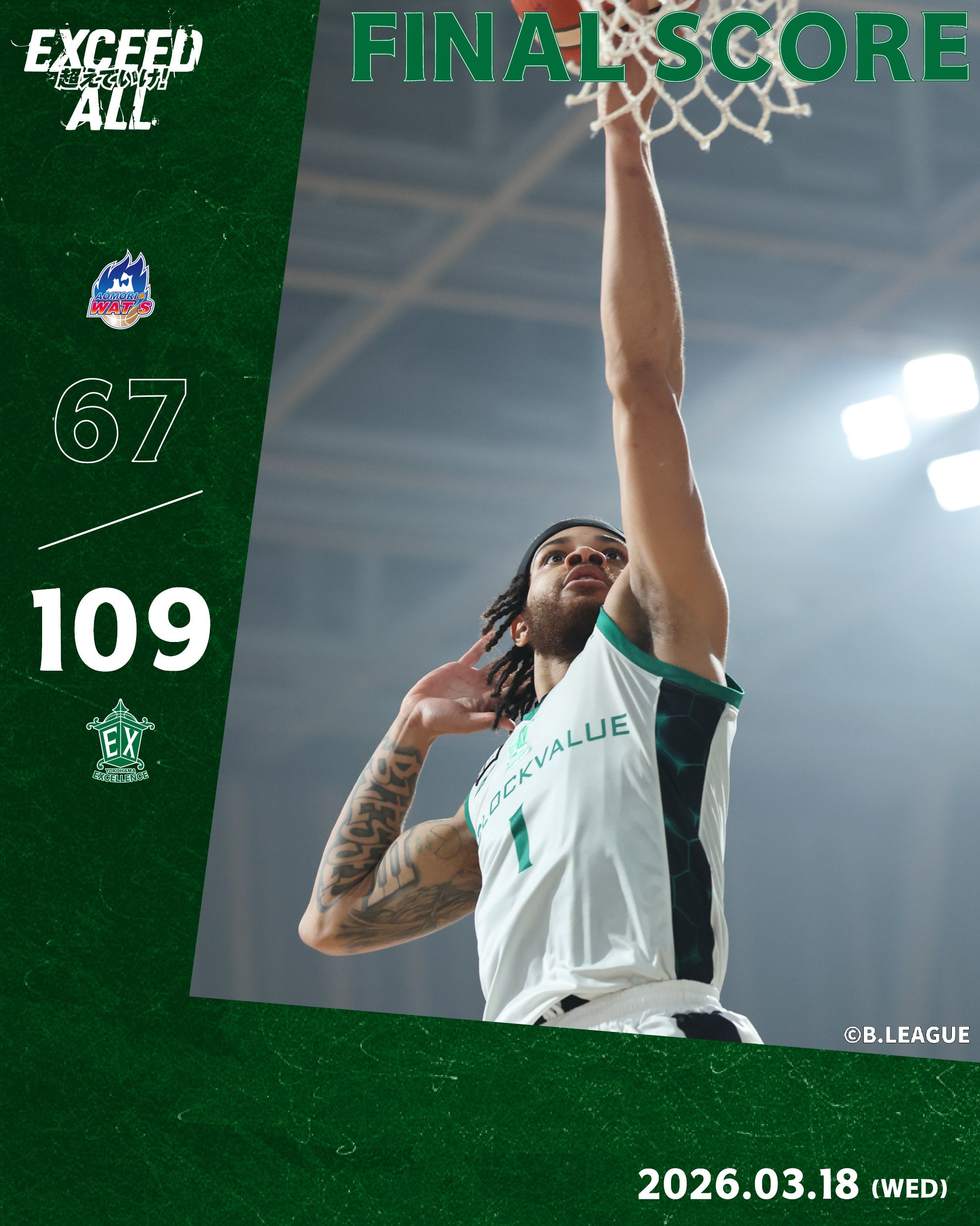 2026年3月18日(水)に行われた「りそなグループ B.LEAGUE 2025-26 B2リーグ戦」第25節。アウェーでの青森ワッツ戦に臨んだ横浜EXは、主軸を含む5選手が非帯同という絶体絶命のロスター編成ながら、109-67という驚愕のスコアで圧勝。