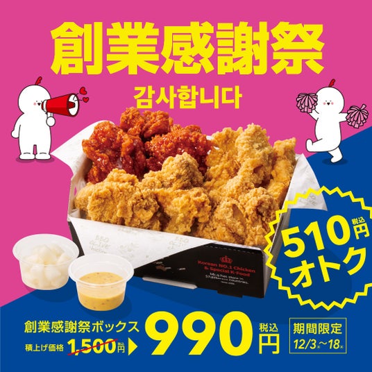 ワタミ株式会社(本社:東京都大田区、以下ワタミ)が国内で運営する、韓国No.1 フライドチキンブランド『bb.q オリーブチキンカフェ(以下、オリーブチキンカフェ)』は、12月3日(火)~18日(水)の期間限定で「創業感謝祭ボックス」(990円税込)を販売いたします。