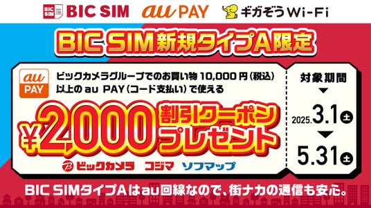 さらに、新規でタイプA回線をお申込みいただくと、ビックカメラグループでご利用いただけるau PAYクーポン2,000円相当をプレゼントします。