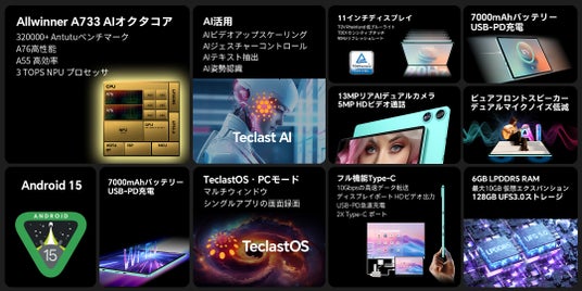 11インチのTUV Rheinland認定IPSディスプレイは、目に優しい低ブルーライト技術を採用し、長時間の使用でも快適です。90Hzの可変リフレッシュレートとAI搭載T-Colour 6.0が、スムーズな映像と鮮やかな色彩を提供します。13MPのAIデュアルカメラと5MPフロントカメラが、鮮明な写真やビデオ撮影を可能にし、カメラ共有機能を利用すればPCやオンライン会議での活用も簡単です。PCモードを利用してタブレットをPCライクに操作でき、複数のウィンドウ操作やマルチタスク機能で効率的な作業をサポートします。Teclast P50AIは、AIとAndroid 15の力を活かし、エンターテインメント、仕事、学習のあらゆる場面に対応する理想的なタブレットです。