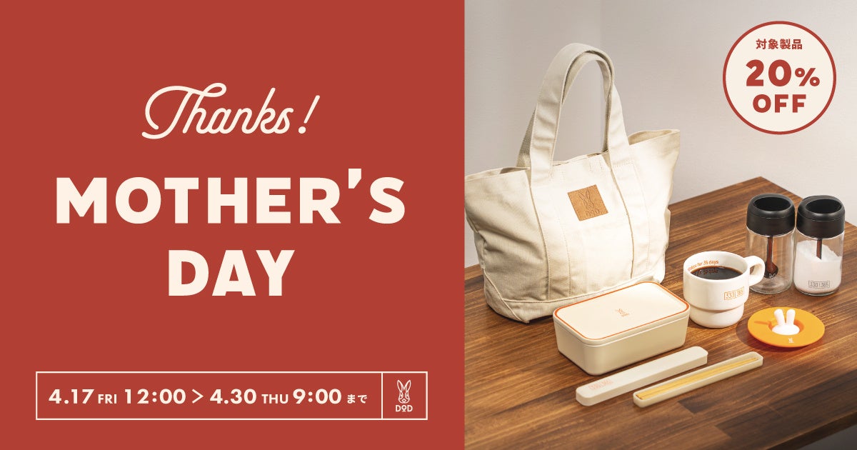 ビーズ株式会社(本社:大阪府東大阪市、代表取締役社長:大上響)が展開するアウトドアブランドの 「DOD」は母の日のギフトにぴったりな製品をピックアップした特設ページを2026年4月17日より公開しました。ページ内では対象製品が20%オフとなる期間限定クーポンを掲載しています。