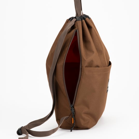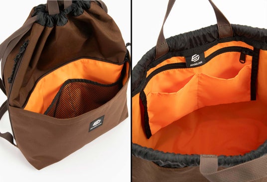内装には、視認性を高める明るいオレンジカラーの生地を採用し、中身が見えるメッシュポケットを配置。薄暗い場所でもスムーズに荷物を取り出せます。さらに、引き手紐には反射材を織り込み、夜間の安全性にも配慮しました。