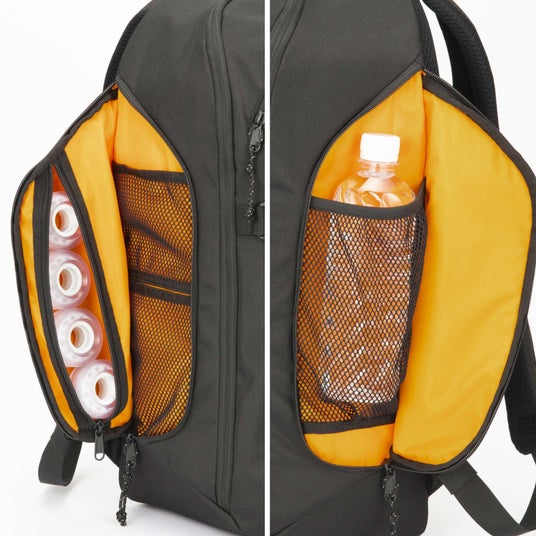 3. ペットボトルや折り畳み傘などを立てて収納できるサイドポケットや、スケートに必要な部品や小物なども整理して収納できるポケット。