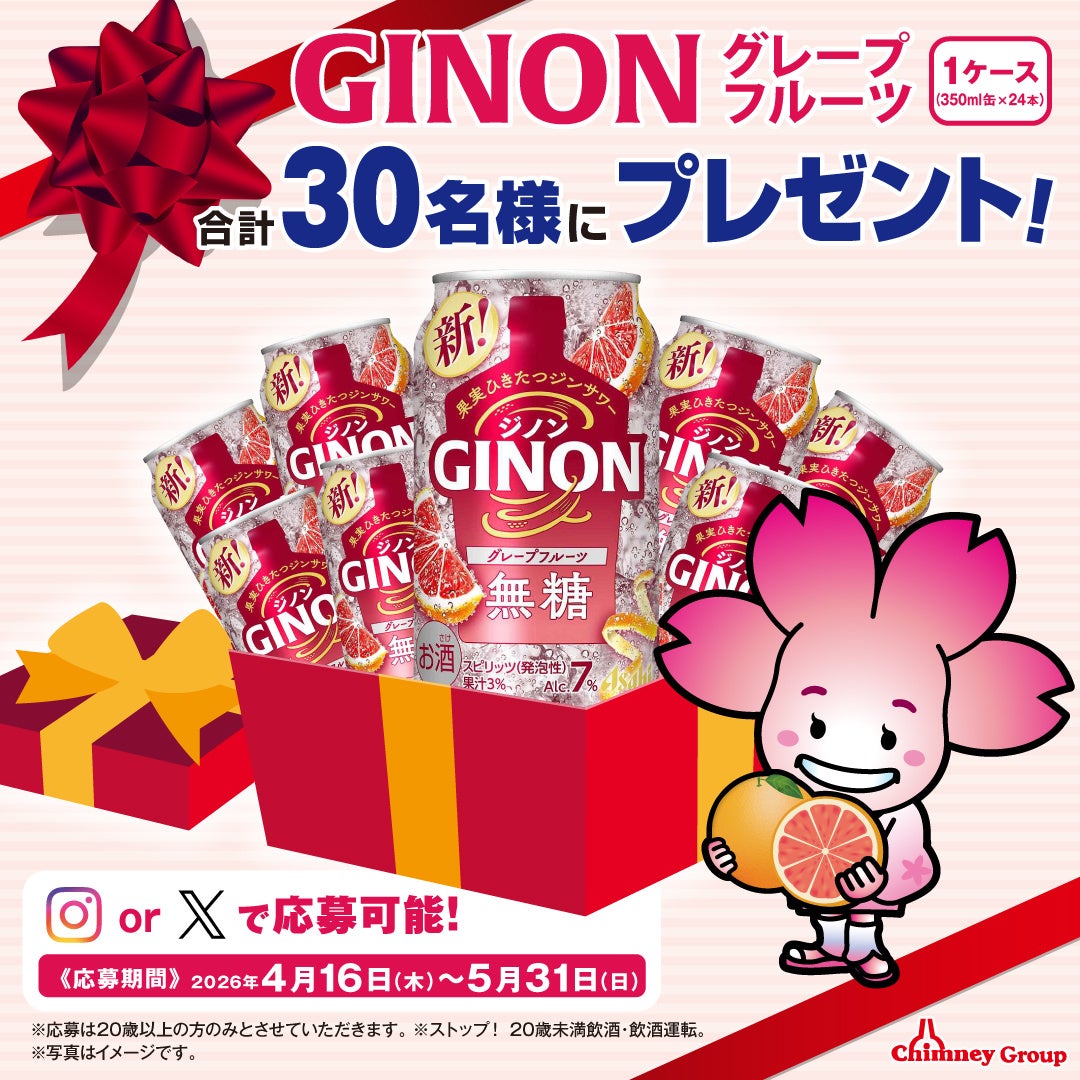 チムニー公式SNS(InstagramとX)で4月16日(木)より応募受付開始!合計30名様にアサヒ「GINON グレープフルーツ」1ケース(350ml×24缶)をプレゼント!