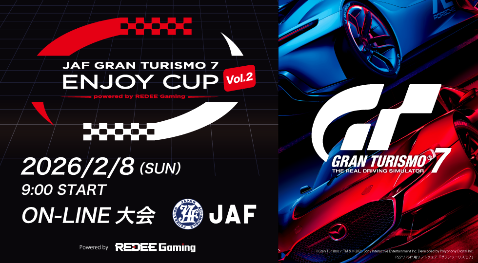 JAF九州本部(本部長 金野誠)は2026年2月8日(日)、REDEE株式会社(代表取締役 密山裕貴)と協働でEモータースポーツイベント「第2回JAF GRAN TURISMO 7 ENJOY CUP」を開催します。