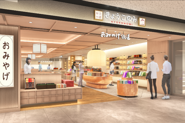 JR京都駅 京都ポルタ地下街東エリア「きょうこのみ」の一画に、「京都らしさ」を体感しながら京都ならではの老舗商品、カジュアルな菓子土産、雑貨商材まで幅広く取り揃え、ワンストップで欲しい土産商品をお買い求めいただける店舗として出店いたします。観光の方々をメインに京都に来られたお客様に、「お土産選びそのものが旅の思い出」と感じていただける空間を提供してまいります。