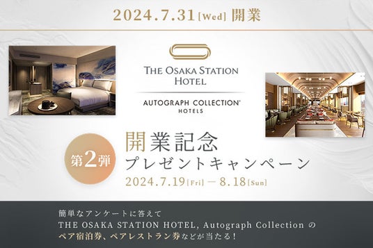 株式会社ジェイアール西日本ホテル開発(大阪府大阪市北区、代表取締役社長 伊勢 正文)は、運営するJR西日本ホテルズの「THE OSAKA STATION HOTEL, Autograph Collection」(「大阪ステーションホテル、オートグラフコレクション」以下「大阪ステーションホテル」)の開業を記念し、アンケートに回答いただいた方を対象に、抽選で大阪ステーションホテルで使える宿泊券やレストラン券が当たるキャンペーンを7月19日(金)から実施中です。