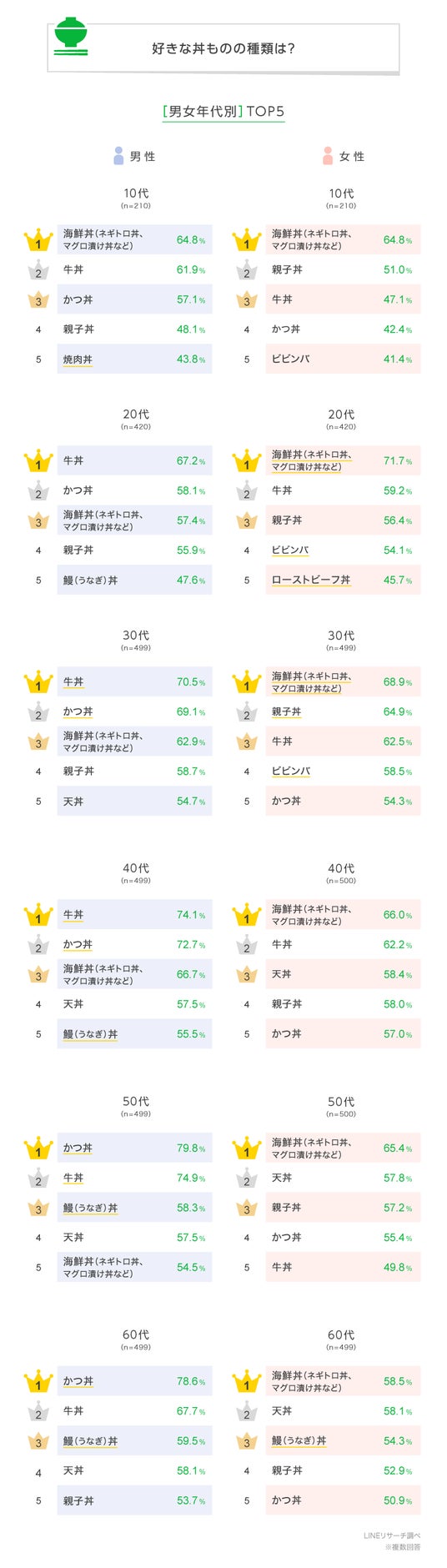 「LINEリサーチ」では、全国の10~60 代の男女を対象に、好きな丼ものについて調査しましたので、結果をお知らせします。