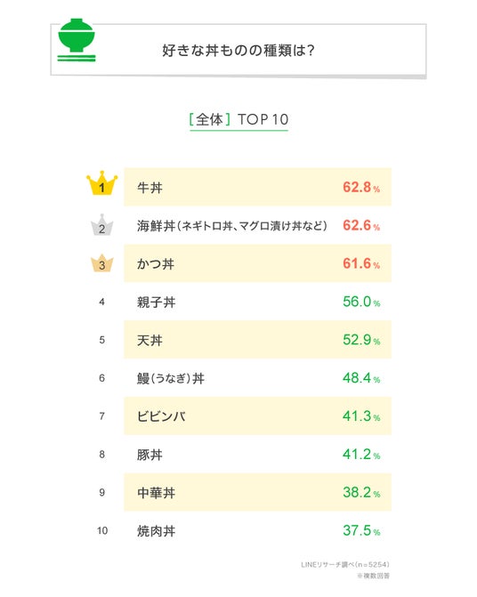 【LINEリサーチ】好きな丼ものの種類TOP3は「牛丼」「海鮮丼」「かつ丼」!