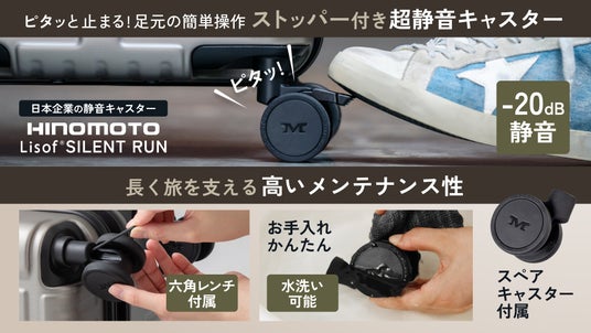 旅先でのキャスター故障も心配無用!交換可能キャスターを採用し、誰でも簡単に取り替えが可能です。さらに、HINOMOTOと三菱ケミカルが共同開発した「Lisof(R)︎ SILENT RUN」超静音キャスターを搭載。深夜や早朝の移動でも音を気にすることなく、ストッパー機能付きで、電車やバスでも安定感抜群です。(意匠登録番号:1734959)
