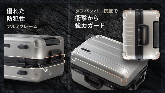 軽さと強さを両立するドイツ製100%ポリカーボネート素材を採用し、驚異的な耐久性を誇ります。特に衝撃を受けやすいコーナー部分には、極太バンパーを搭載し、ダメージを最小限に抑えます。さらに、刃物に強いワイドアルミフレームを採用し、防犯性能を強化。どんなシーンでも、大切な荷物をしっかり守ります。