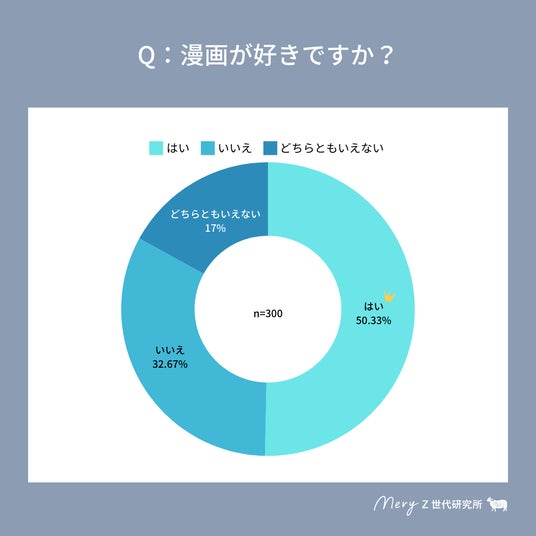 Z世代の男女300名を対象に漫画に関するアンケートを実施。「漫画が好きか」と質問したところ、過半数となる50.33%が「はい」と答えた。