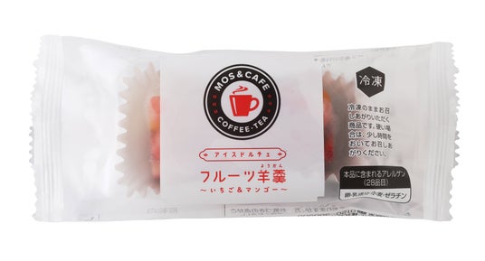 ●「アイスドルチェ フルーツ羊羹(ようかん) ~いちご&マンゴー~」甘さ控えめの水羊羹に、いちごとマンゴーをトッピングしました。フルーツの甘ずっぱさとシャ リッとした食感がアクセントの新感覚のフルーツ羊羹です。いちごの赤色とマンゴーの黄色の鮮やかな見た目もお楽しみください。