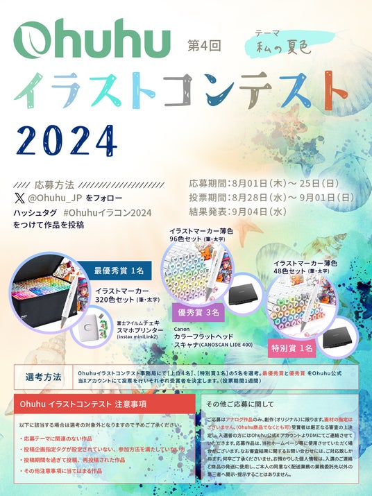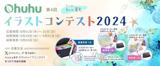 人気イラストマーカーや画材を展開するメーカー、Ohuhu(オフーフー)では今年もイラストコンテストを開催!日本公式X (旧Twitter)「@Ohuhu_JP」にて、創作及びアナログ作品を募集します。今回のテーマは「私の夏色」、自分らしい色で夏を表現しましょう。受賞者には、イラストマーカーセット他、豪華アイテムをご用意!皆様からの沢山のご応募お待ちしております。