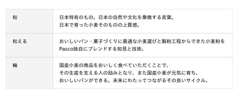 ロゴマークには、これからも皆さまにおいしい国産小麦のパンを届けつづけるというPascoの想いを込めています。