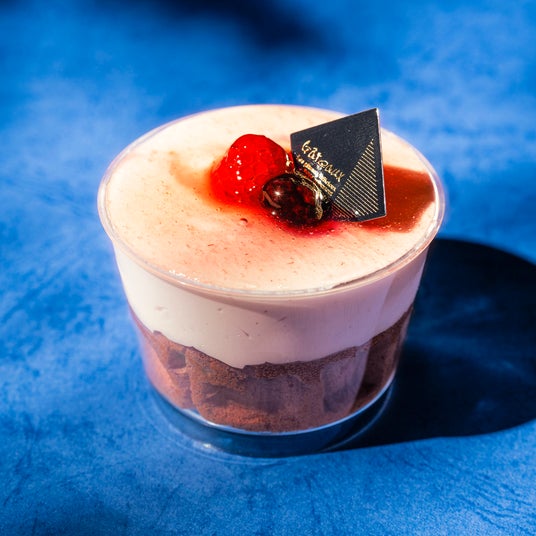 ムースの上にラズベリー風味のゼリーを重ね、ブルーベリーとラズベリーの果肉をトッピング。
