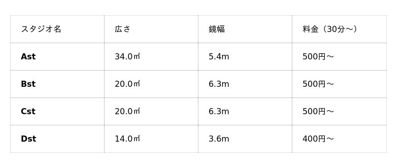 スタジオ数: 4スタジオ料金: 400円~/30分