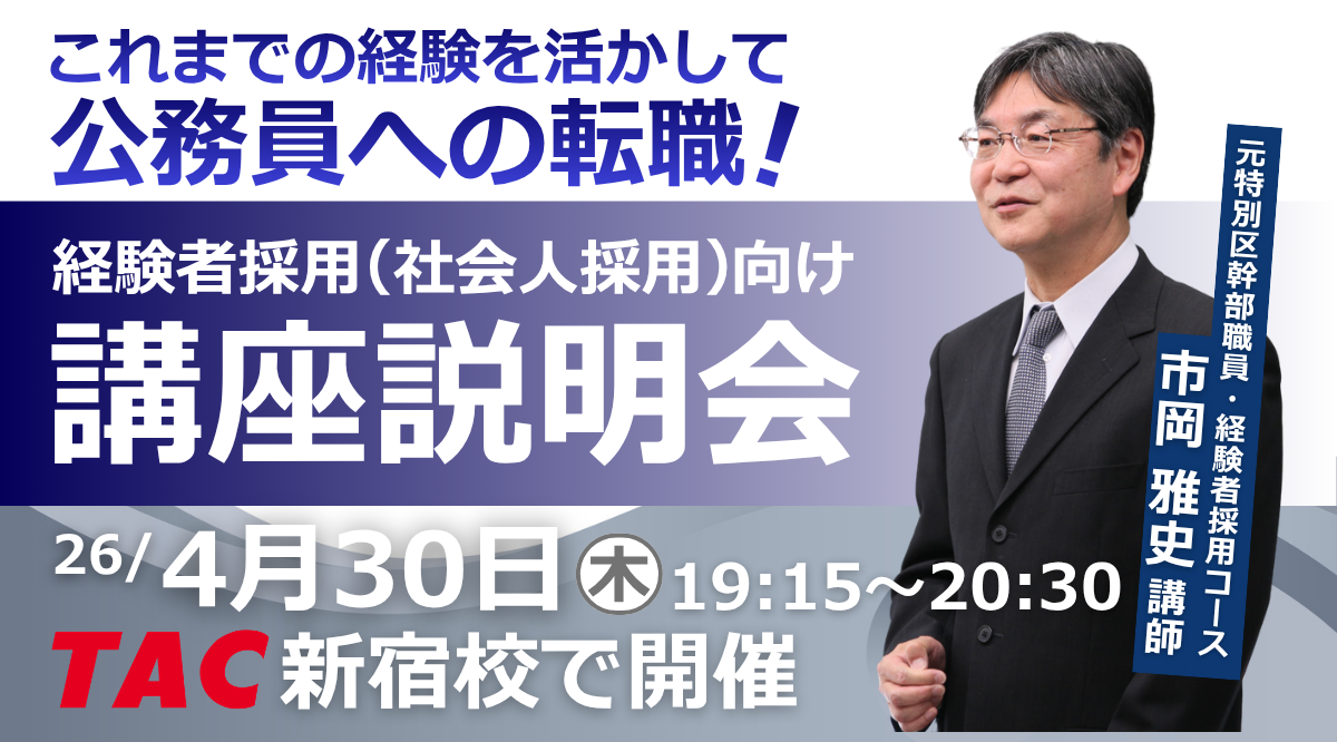 【TAC公務員(経験者採用)】4/30(木)にTAC新宿校にて開催「元公務員が講師!経験者採用向けガイダンス」