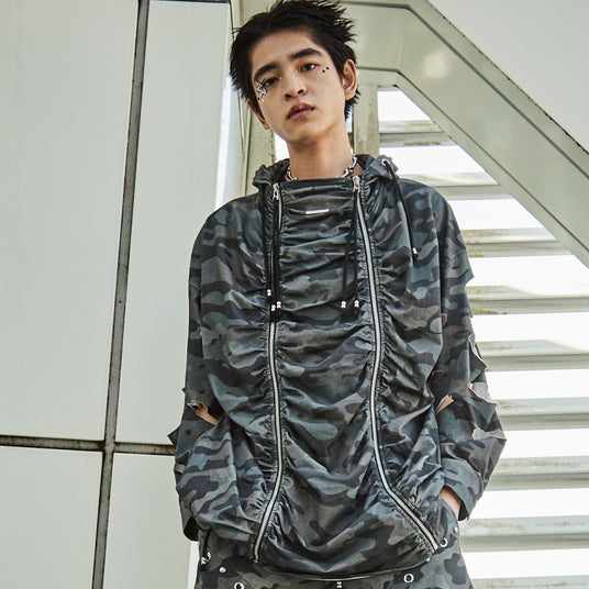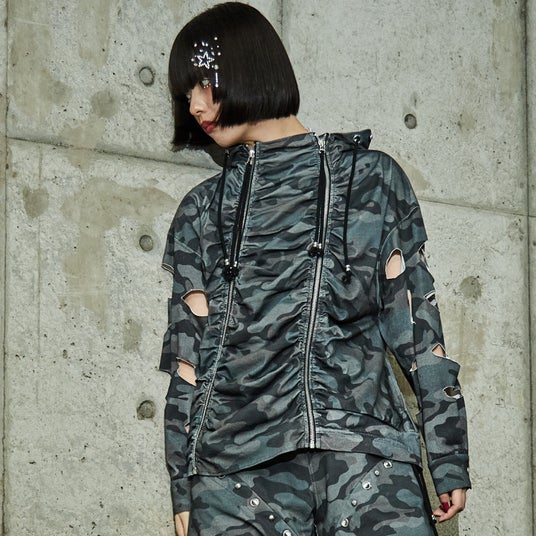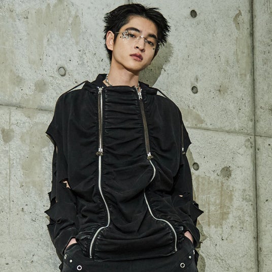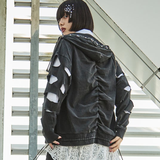 スタッズやファスナーなどメタルパーツが目を惹くパーカー。