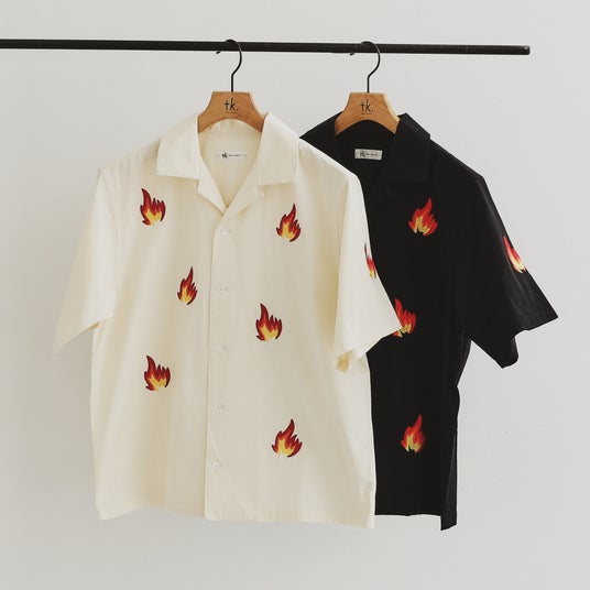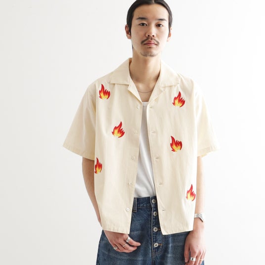 落書きのような遊び心のある、フレイム(炎)デザインを刺繍で表現したシャツ。