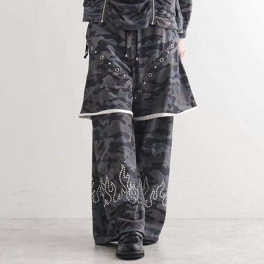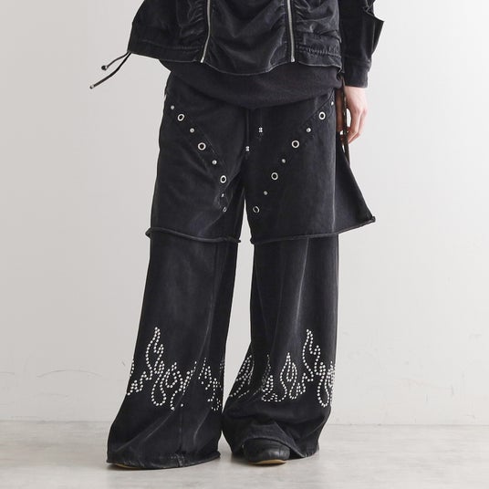 ショーツを重ね着したようなレイヤードデザインと、裾にあしらったスタッズが目を惹くスウェットパンツ。