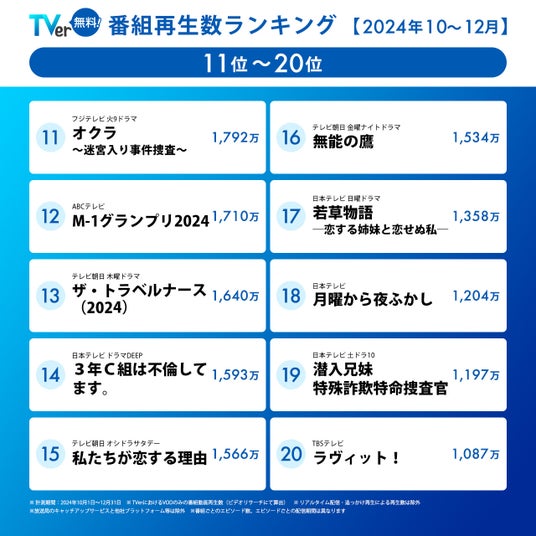 民放公式テレビ配信サービス「TVer(ティーバー)」より、2024年10-12月の全配信番組を対象とした「番組再生数ランキング」上位20番組をお知らせします。