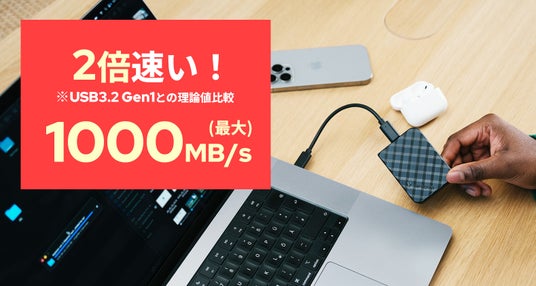 USB 3.2 Gen2インターフェースを搭載し、データ転送速度は読み出し最大1,000 MB/秒、書き込み最大1,000 MB/秒※と、大容量データの転送やビデオ編集、ゲームパフォーマンスの最大化にも最適です。 WindowsとMacの両方に対応しており、付属品としてUSB Type-C to Cケーブルを同梱しております。