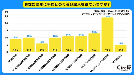 続いて、「年に平均どのくらい収入を得ているか」質問したところ、24%の大学生が「90万円以上103万円未満」と回答しました。「103万円以上」収入を得ているのは全体の5%という結果から、アルバイトをしている大学生の95%は103万円の壁を超えずに働いていることが伺えます。