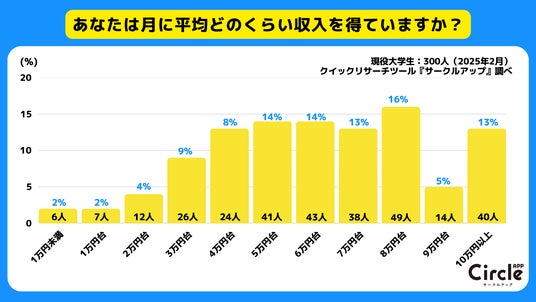 まず、「月に平均どのくらい収入を得ているか」質問したところ、「5万円台」14%、「6万円台」14%、「7万円台」13%、「8万円台」16%、「10万円台」13%という結果 (10%以上得た選択肢のみ抜粋) を得ることができました。