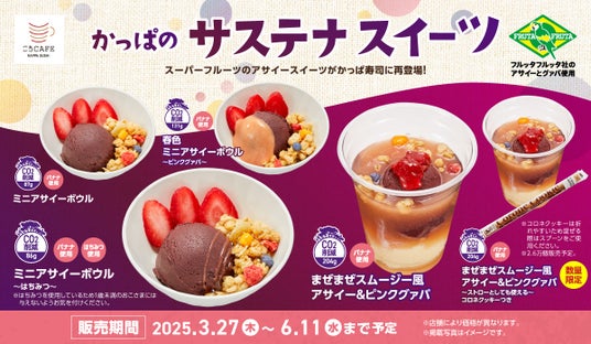 コロワイドグループのかっぱ寿司(カッパ・クリエイト(株) 本社:神奈川県横浜市、代表取締役社長:山角豪)は、2025年3月27日(木)~6月11日(水)の期間、株式会社フルッタフルッタのアサイーを使用したスイーツ4品をかっぱ寿司全店にて販売いたします。