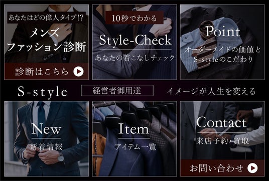 “人生に自信と輝きを”S-styleは、政財界のVIPやビジネス・エグゼクティブを中心に、ファッションスタイリングからオーダーメイドまでトータルで提供する銀座のプライベートサロンです。