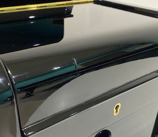 最初のメモリアルBOXは、鍵盤は入っていたものの、部材を使っただけの四角い箱型でした。でも、ピアノはメーカーや機種によって表情がそれぞれ違うので、その面影を残したデザインで仕上げることを重視し、お客様が一番たくさん触れたであろう鍵盤や鍵盤蓋、想い出の傷なども残すように1台1 台 デザインするようになりました。 1.鍵盤を残す お客様の意向を伺いながら残す場所を決めます。鍵盤は、一番よく使っている真ん中の1オクターブを使用することが多いです。 2.鍵盤蓋を残す 鍵盤蓋は、ピアノを弾くたびに何度も触れている場所です。内側の真ん中にロゴや鍵、譜面台がある場合が多く、この部分を残すことをお薦めしています。(1台につき2個以上製作の場合は、ロゴや鍵付きは1個のみ) 3.面影を残す ピアノは、鍵盤両サイドの腕木の部分や支える脚の形は、メーカーや機種によって1台1台違います。特徴のある形をできるだけ残すようにしています。 4.傷や塗装の状態をそのまま残すことも 汚れは綺麗にお掃除しますが、塗装の状態や傷などの思い入れのある部分は、お客様のご意向をお聴きしながら、そのまま残すことも多くあります。