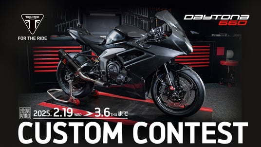 トライアンフモーターサイクルズジャパン株式会社(本社:東京都港区海岸 代表取締役社長:大貫陽介)はトライアンフの中でも人気のDaytona 660を更に盛り上げるべく、2月19日(水)~3月6日(木)までの期間中、本コンテストにエントリーしたトライアンフ正規販売店が制作した、DAYTONA 660カスタムバイクの人気投票「DAYTONA 660カスタムコンテスト」を実施する事をお伝えします。