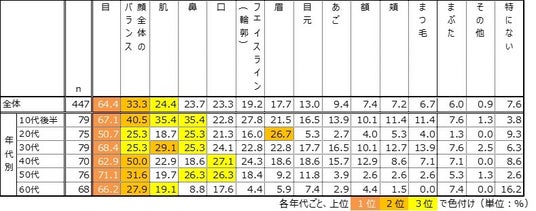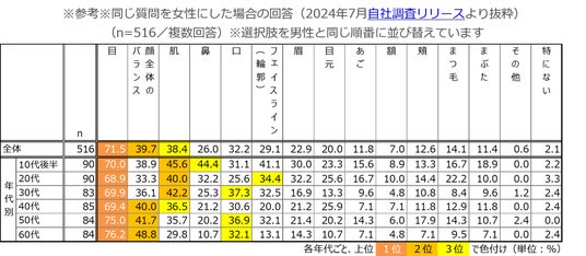 - 「顔全体のバランス」「肌」の上位ランクインも女性と同様