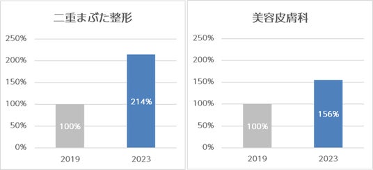 上述のアンケートで男性が「目」「肌」を重要なパーツと位置付けているとの結果となったが、美容整形のハードルが下がってきた社会的背景もあってか、聖心美容クリニックでは、2019年ー2023年の4年間で「二重まぶた」「美容皮膚科」の施術を受ける男性の新規患者様が急増している。