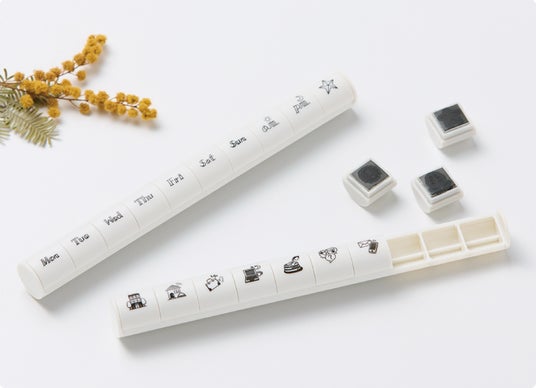 ペンケースに収まりのいいスティック型のミニスタンプ。日記や手帳デコなどで日常使いができそうな10種の絵柄をひとつにまとめました。「ビジネス」「家計簿」「ボディメイク」「学校」「数字」「週&時間帯」の6つのテーマをご用意しています。