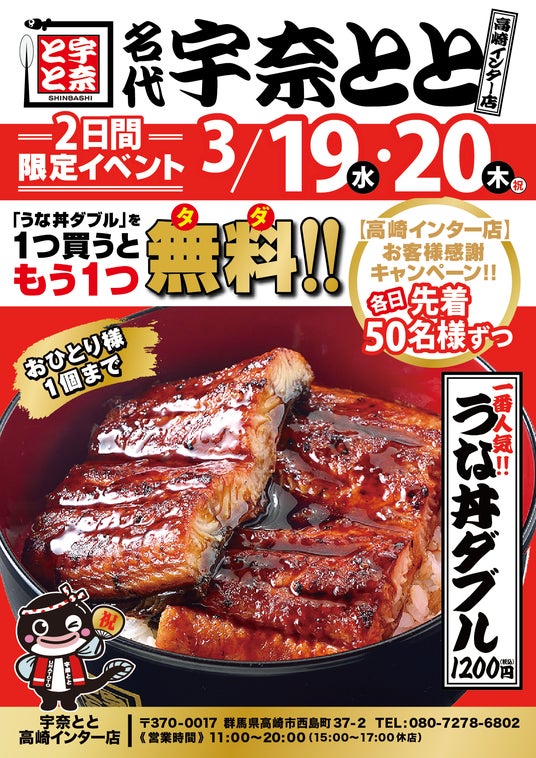 3月19日(水)、20日(木・祝)に名代 宇奈とと 高崎インター店にてキャンペーン開催