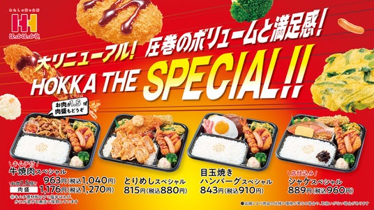 持ち帰り弁当事業のパイオニアである「株式会社ほっかほっか亭総本部(本社:大阪府大阪市、代表取締役会長兼社長:青木達也)は、2025年6月1日(日)より、「のりスペシャル」をはじめとする、「スペシャルシリーズ」全9種類(西日本エリア)をリニューアル新発売いたします。 1976年6月6日、埼玉県草加市に、ほっかほっか亭の1号店が創業。49年経った現在、米や野菜の価格が高騰する苦しい状況の中、パスタ麺を使用した「焼きそば」や「ナポリタン」なども採用しながら、よりお客さまがお求めやすいメニューの提供を続けてきました。 この度、創業から49年目を迎える2025年6月、お客さまにさらなる感謝の気持ちを込めて、ほっかほっか亭の人気のおかずをたっぷり詰め込んだ「スペシャルシリーズ」を大リニューアル新発売いたします。この「スペシャルシリーズ」は、ほっかほっか亭の商品の中でも高価格帯に分類されるにも関わらず、根強い人気とご指示をいただいています。今回のリニューアルは、創業当時からのほっかほっか亭の想いである「お客さまにおいしいものをお腹いっぱい食べていただきたい」ということを根幹として開発。是非、お腹いっぱい召し上がってください。 商品紹介 ほっかほっか亭 スペシャルシリーズ この度の大リニューアルでは、4種類のスペシャルおかずがそれぞれのお弁当に入ります。大人気の「えびフライ」は、サクサク衣とプリプリの身の引き締まったえびが特長。昨年のリニューアル直後からの復活を望む声にお応えし、復活を遂げました。また、野菜もおいしく食べられる「手づくりニラ玉」は、お店での手づくり感を楽しめる一品で、今後は季節によって野菜を変更予定の副菜です。他にも、お弁当に合うようにオリジナル開発した、人気の「ポークウインナー」や「コロッケ」が入ります。 のりスペシャル:790円(税込) スペシャルシリーズで、不動の人気No.1メニュー。今回のリニューアルでは、おかずも新たに、30円お得になりました。(西日本価格) のり弁当の象徴でもある白身フライはもちろんのこと、ちくわ磯辺も通常同様ロングサイズになっています。ボリュームのり弁当を楽しむことができます。 のりスペシャル しょうが焼スペシャル:890円(税込) 「スペシャルシリーズ」に新たに仲間入りするしょうが焼。 レギュラー弁当「しょうが焼弁当」の2倍量のしょうが焼が入っていて、たっぷりとご賞味いただけます。 しょうがの下味をつけた豚バラ肉に、店内でカットした玉ねぎとしょうが感のあるオリジナルのたれを絡めて炒めています。ごはんに合うように味付けをした、トッピングの粗きざみしょうがと一緒に召し上がっていただきます。 しょうが焼スペシャル 唐揚スペシャル:790円(税込) ほっかほっか亭自慢の唐揚が3コ入った、スペシャル弁当です。外はカリカリ、中はジューシーな鶏もも肉のオリジナル唐揚でごはんもすすみます。おかずのボリュームもちょうどよく、食べやすいスペシャルシリーズメニュー。 唐揚スペシャル チキン南蛮スペシャル:890円(税込) スペシャルのラインナップでも人気のチキン南蛮スペシャル。カリッと揚げた鶏肉に、オリジナルの黒酢あんと、たまごたっぷりのタルタルソースの相性が抜群で、究極のコンビネーションです。添え物のスパゲッティに黒酢あんとタルタルソースを絡めても食べても絶品の逸品となっています。 チキン南蛮スペシャル ほっかほっか亭 スペシャルシリーズ 牛焼肉スペシャル:1,040円(税込) 店内で炒める牛バラ肉と玉ねぎにオリジナルのたれが絡み合うスタミナたっぷりのメニューです。蓋を開けた瞬間に、食欲をかき立てる香りが飛び込んできます。キムチ付で、箸休めにもちょうど良いピリ辛感。 もっとがっつりと食べたい方にぴったりな、お肉が1.5倍の肉盛は、1,270円(税込)でのご提供です。 牛焼肉スペシャル とりめしスペシャル:880円(税込) のり弁当でも大人気の白身フライとちくわ磯辺を採用したメニュー。スライスされた唐揚に、自慢のとりめしのたれをたっぷりかけて、思いきり頬張ってみてください。どのおかずから食べるか迷うくらいのバラエティ豊かなスペシャル仕様です。 ※こちらの商品は、西日本エリアでのみ取扱い予定です。 とりめしスペシャル 目玉焼きハンバーグスペシャル:910円(税込) ふっくらとやわらかいハンバーグに、相性バツグンの特製デミグラスソースをかけて仕上げた自慢のメニューです。目玉焼きとベーコンがアクセントで、これぞ弁当!と言える、ごはんによく合うメニューに仕上げました。 ※こちらの商品は、西日本エリアでのみ取扱い予定です。 目玉焼きハンバーグスペシャル シャケスペシャル:960円(税込) 紅鮭を使用した、シャケスペシャルが復活。店内で焼き上げた濃厚な紅鮭に、たまごやきや、きんぴらなどの和惣菜も入った和食テイストのメニュー。紅鮭とごはんのお供としてもぴったりな椎茸昆布も添えています。 ※こちらの商品は、西日本エリ