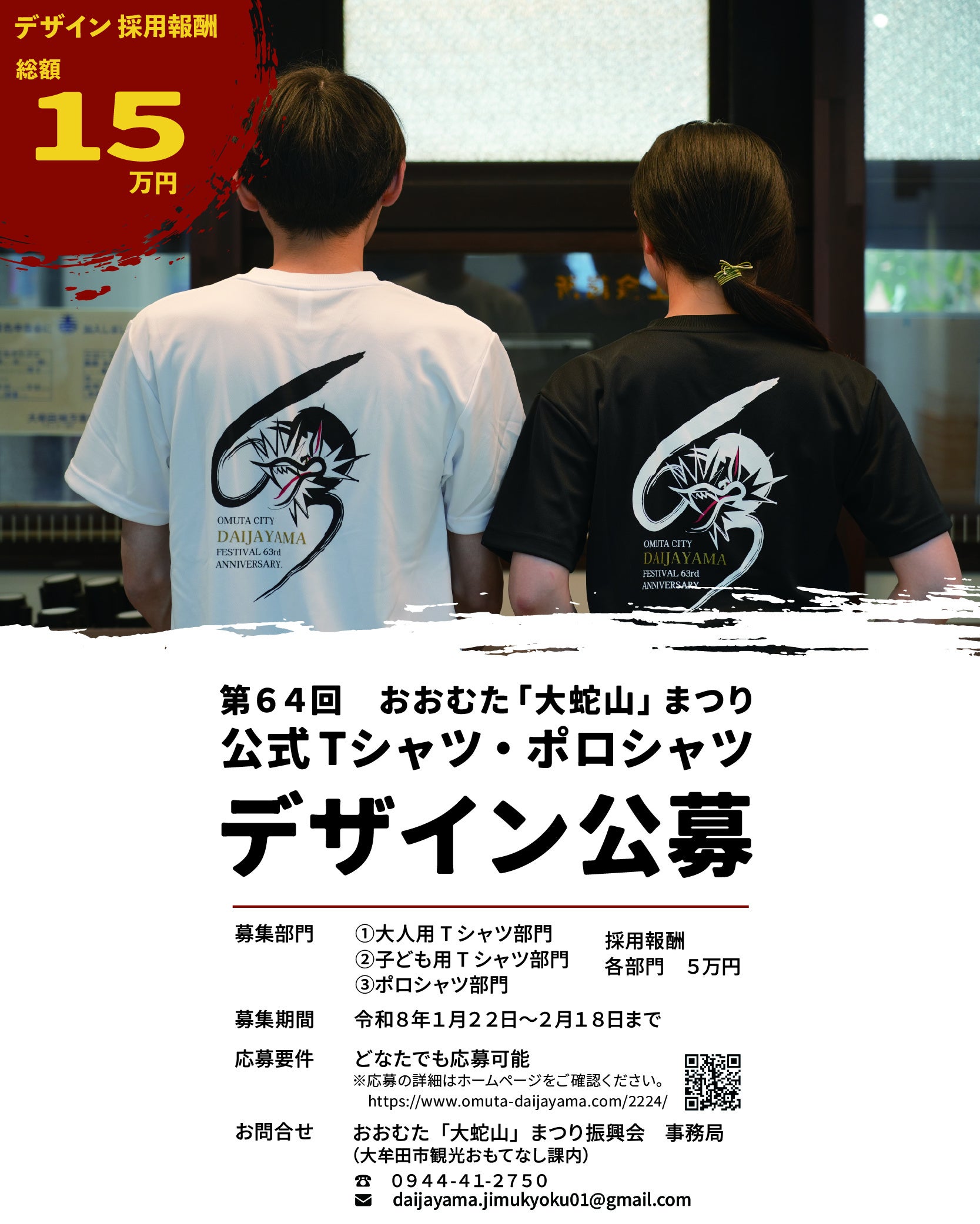 今年の第64回おおむた「大蛇山」まつり開催に向けて、まつりのムードの盛り上げに欠かせない「公式Tシャツ・ポロシャツ」のデザインと長期的に使用していくロゴマーク等の募集をしています。詳細はそれぞれの「公募要領」をご確認ください。たくさんの方からのご応募をお待ちしています!
