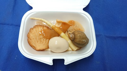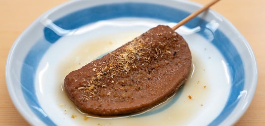 白焼とはスケトウダラのすり身の素焼きのことです。白焼きというだけあり、本来は白い色をしているのですが、静岡おでんの濃い味のダシをたっぷり吸い込んで真っ黒になります。淡白な味わいで、ふわふわもちもちの食感。噛むほどにたっぷり染みたダシの旨みがじゅわっと口に広がります。ヘルシーで人気の一品です。