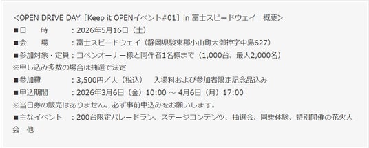 ダイハツ工業株式会社(以下、ダイハツ)は、軽オープンスポーツカー「COPEN(コペン)」が2026年8月に現行モデルの生産を終了することに伴い、支えていただいたお客様への感謝と、これまで築いてきたコペンファンの皆様との絆を未来につなげ続ける決意と感謝の意を込め、スペシャルイベント「Keep it OPEN」を開催します。本イベントは2026年5月16日に実施する第一弾「OPEN DRIVE DAY」を皮切りに、様々なプログラムを予定しており、本日より本イベントへの参加申込を開始します。