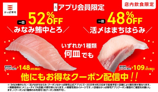 期間中、アプリ会員向けに配信されるクーポンをお会計時にご提示いただくと、店内飲食限定でいずれか一種類を何皿でもお得な価格にてご提供いたします!『みなみ鮪中とろ』『みなみ鮪中とろ塩炙り』『シャリハーフ みなみ鮪中とろ』『活〆はまちはらみ』『活〆はまちはらみ塩炙り』『苺のふんわりチーズムース』『苺のふんわりチーズムース&バニラパフェ』全7種を延長、さらに追加で『赤貝』『シャリハーフ 赤貝』の全2種のクーポンを配信します。